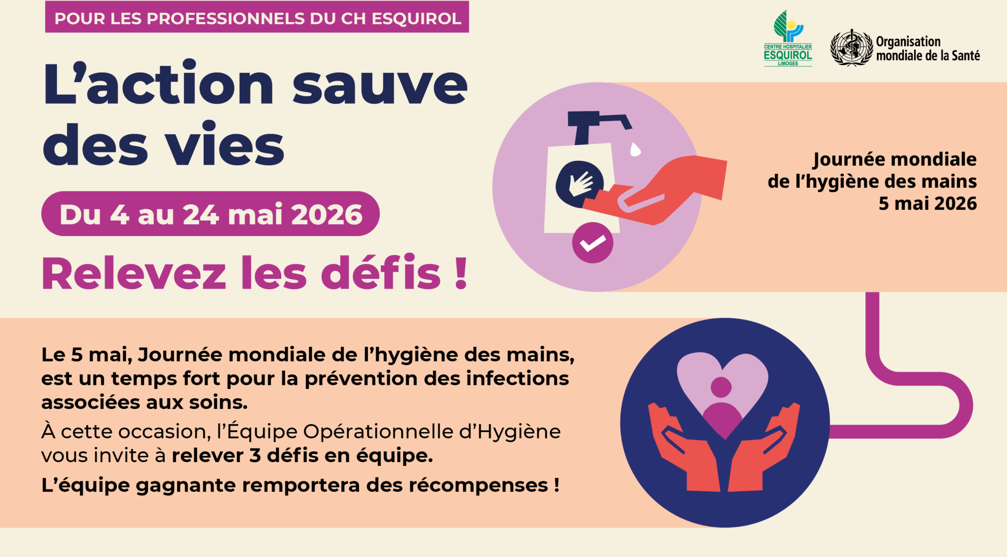 Du 4 au 24 mai, nos équipes sont invitées à relever trois défis ludiques et pédagogiques autour de l’hygiène des mains, un enjeu essentiel pour la prévention des infections associées aux soins.