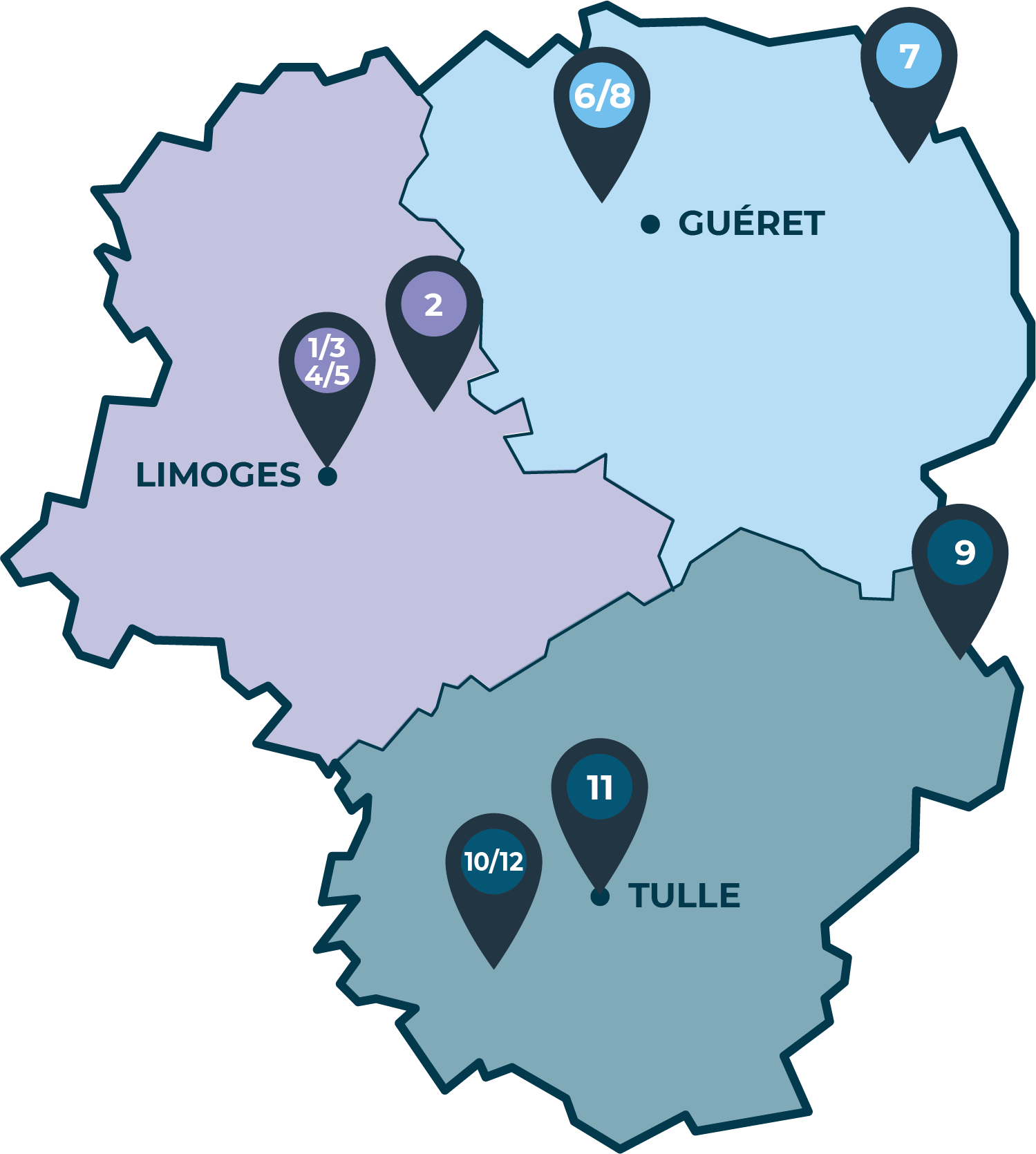 1- CH Esquirol, 2- Clinique La Jonchère Saint Maurice, 3- SAMSAH Prism, 4- Fondation les amis de l'atelier, 5- UTTEP87
